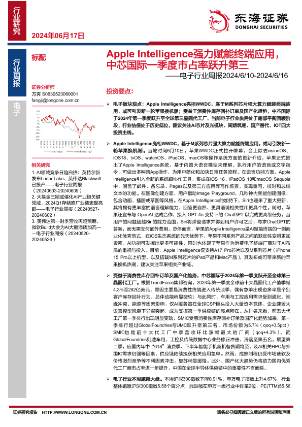 【东海证券】【20240617】20240617-东海证券-电子行业周报:Apple Intelligence强力赋能终端应用,中芯国际一季度市占率跃升第三-14页