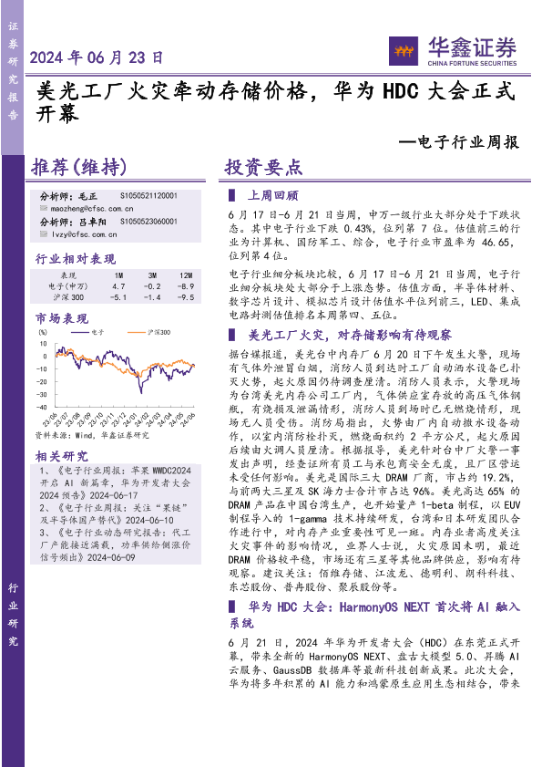 【华鑫证券】【20240623】20240623-华鑫证券-电子行业周报:美光工厂火灾牵动存储价格,华为 HDC大会正式开幕-39页