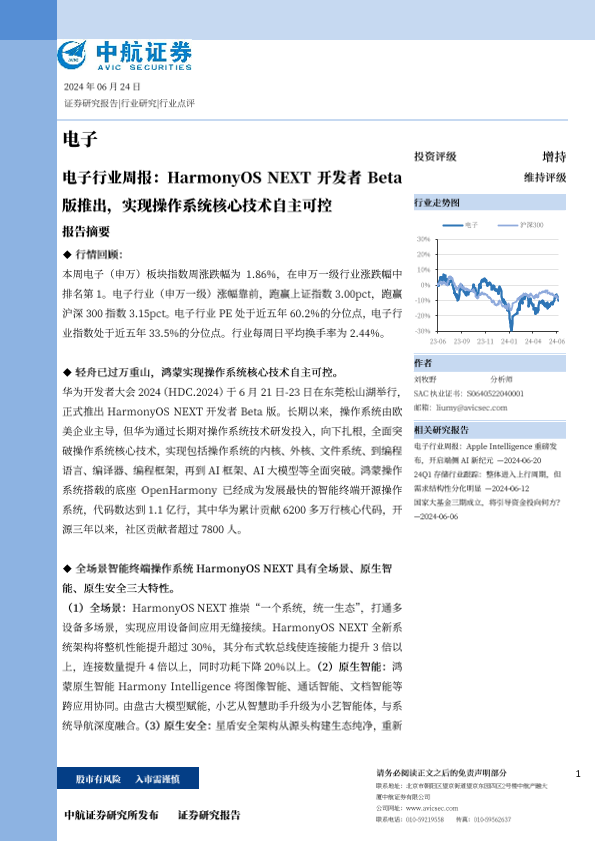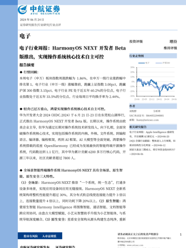 【中航证券】【20240624】电子行业周报 HarmonyOS NEXT开发者Beta版推出,实现操作系统核心技术自主可控-17页