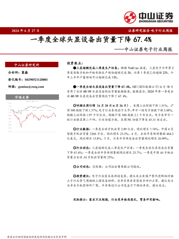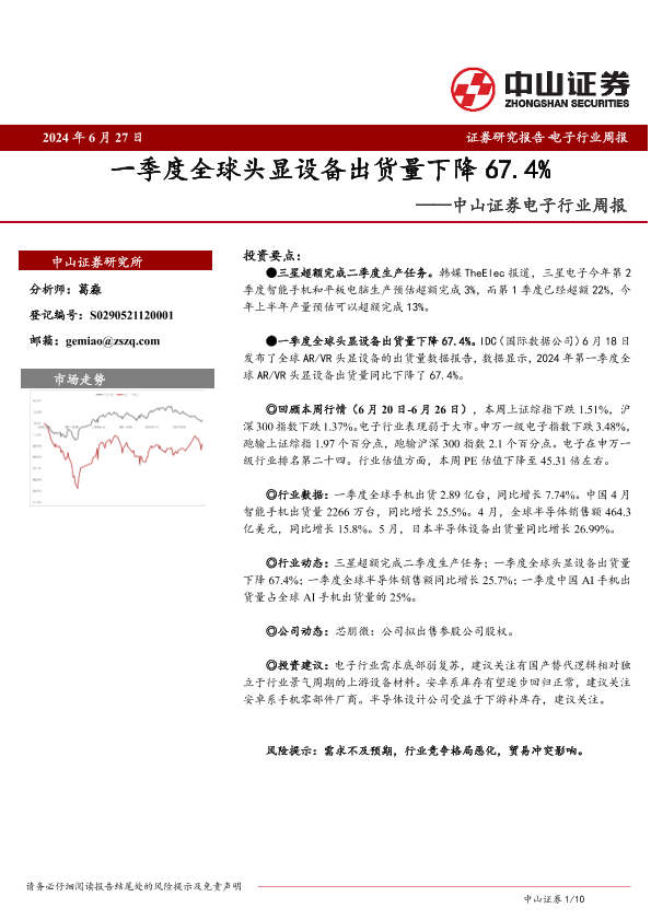 【中山证券】【20240627】20240627-中山证券-电子行业周报:一季度全球头显设备出货量下降67.4%-10页
