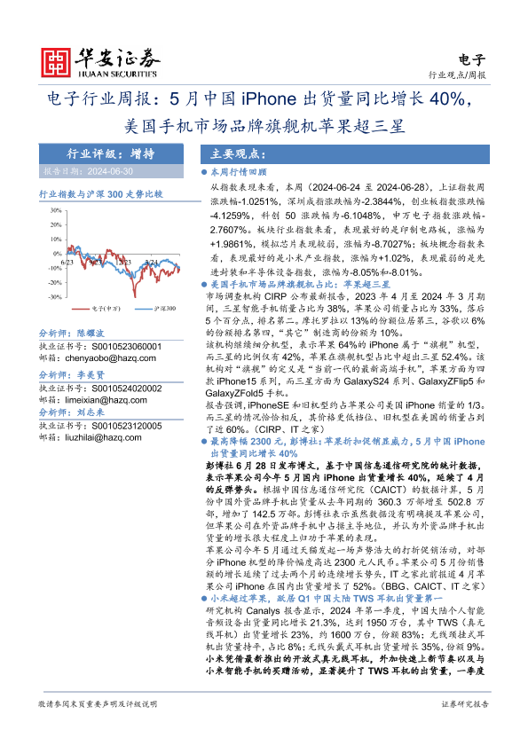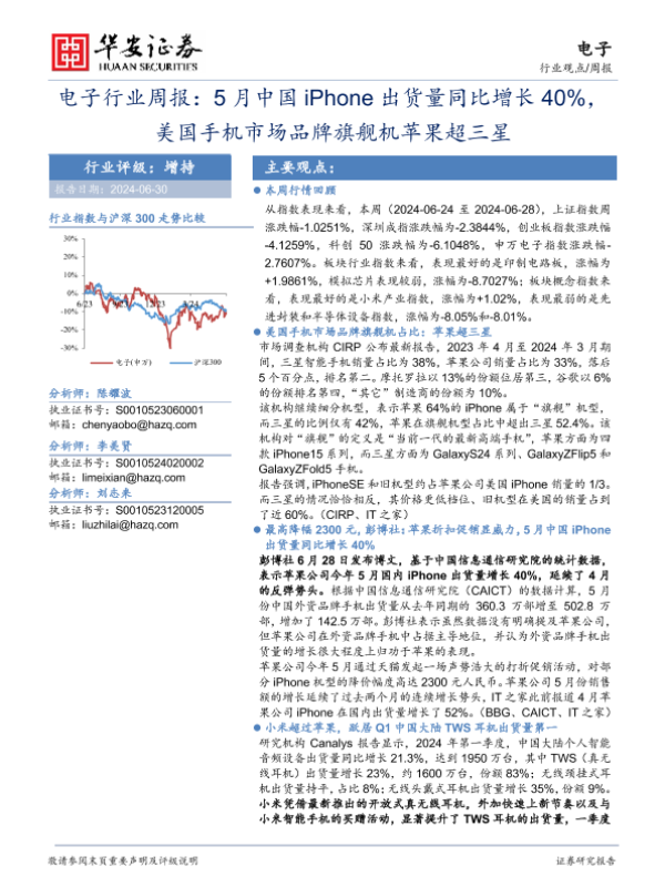 【华安证券】【20240630】20240630-华安证券-电子行业周报:5月中国iPhone出货量同比增长40%,美国手机市场品牌旗舰机苹果超三星-18页