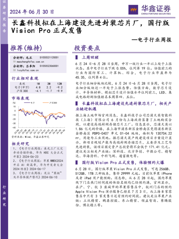 【华鑫证券】【20240630】20240630-华鑫证券-电子行业周报:长鑫科技拟在上海建设先进封装芯片厂,国行版VisionPro正式发售-40页