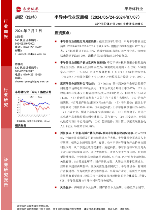 【东莞证券】【20240707】20240707-东莞证券-半导体行业双周报:部分半导体企业24Q2业绩延续高增长-13页