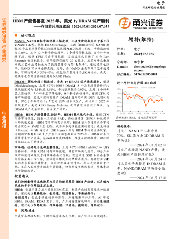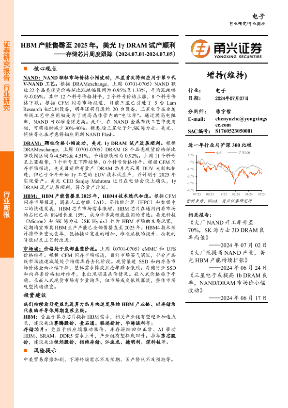 【甬兴证券】【20240707】电子行业存储芯片周度跟踪:HBM产能售罄至2025年,美光1γDRAM试产顺利-10页