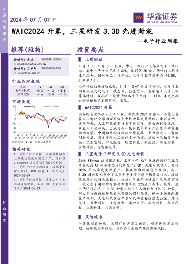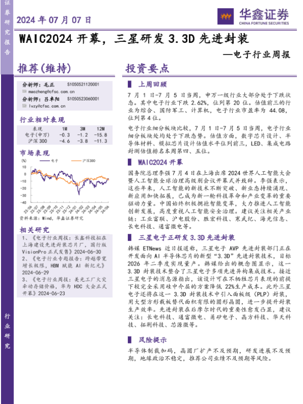 【华鑫证券】【20240707】20240707-华鑫证券-电子行业周报:WAIC2024开幕,三星研发3.3D先进封装-36页