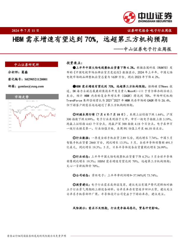 【中山证券】【20240711】20240711-中山证券-电子行业周报:HBM需求增速有望达到70%,远超第三方机构预期-10页