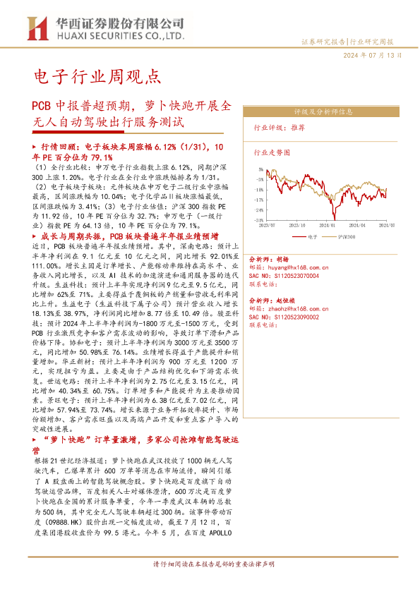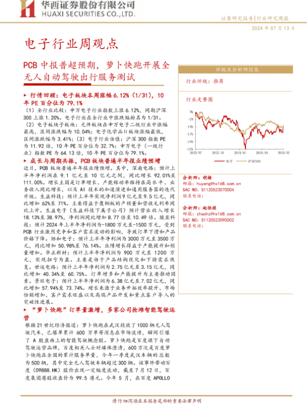 【华西证券】【20240713】20240713-华西证券-电子行业周观点:PCB中报普超预期,萝卜快跑开展全无人自动驾驶出行服务测试-20页