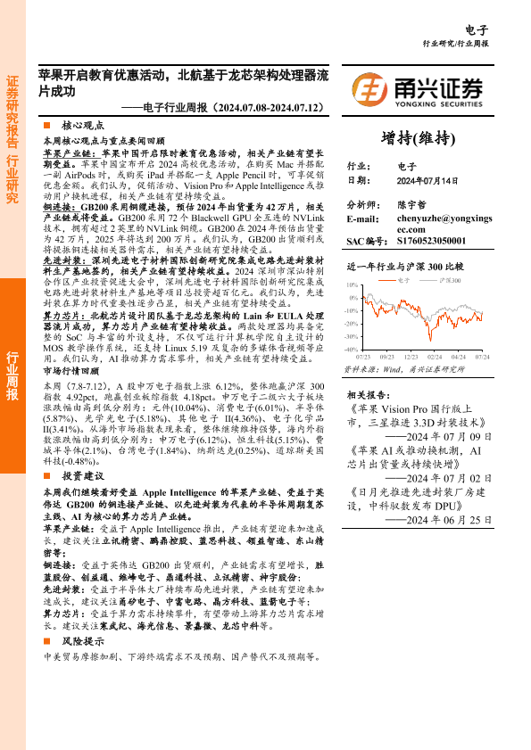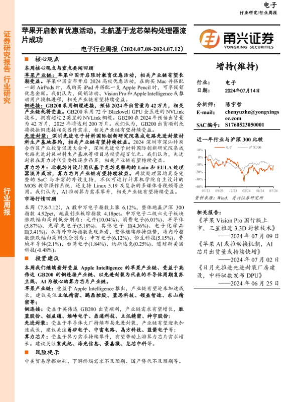 【甬兴证券】【20240714】20240714-甬兴证券-电子行业周报:苹果开启教育优惠活动,北航基于龙芯架构处理器流片成功-13页