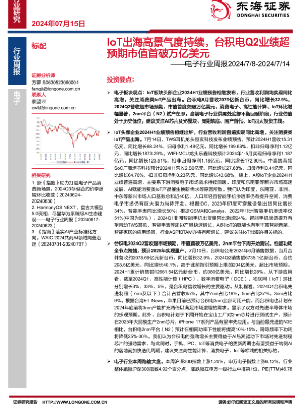 【东海证券】【20240715】IoT出海高景气度持续,台积电Q2业绩超预期市值首破万亿美元-15页