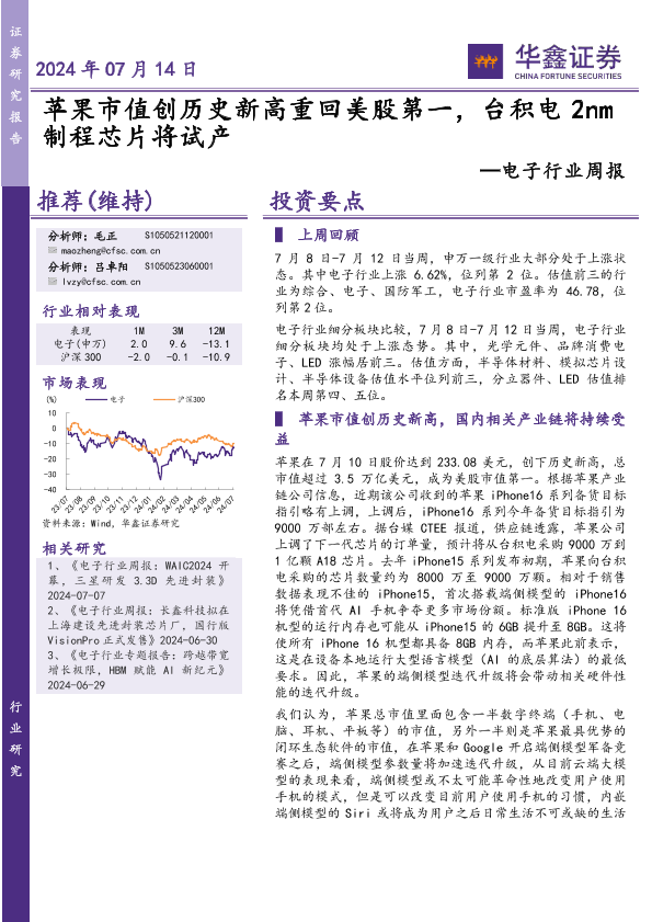 【华鑫证券】【20240714】20240714-华鑫证券-电子行业周报:苹果市值创历史新高重回美股第一,台积电2nm制程芯片将试产-39页