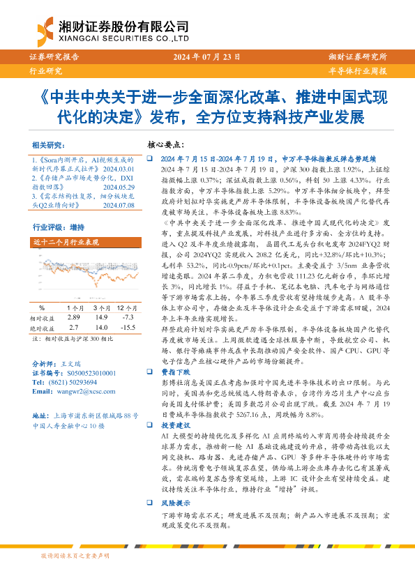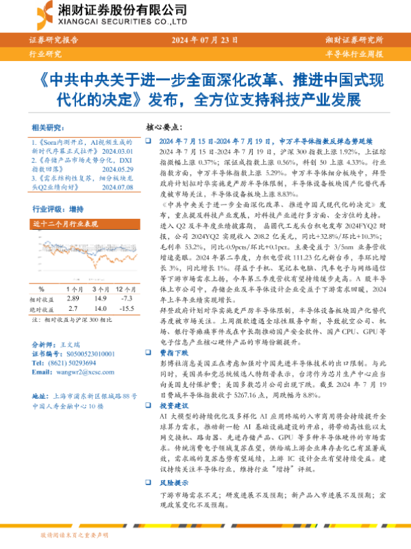 【湘财证券】【20240723】20240723-湘财证券-半导体行业周报:《中共中央关于进一步全面深化改革、推进中国式现代化的决定》发布,全方位支持科技产业发展-11页