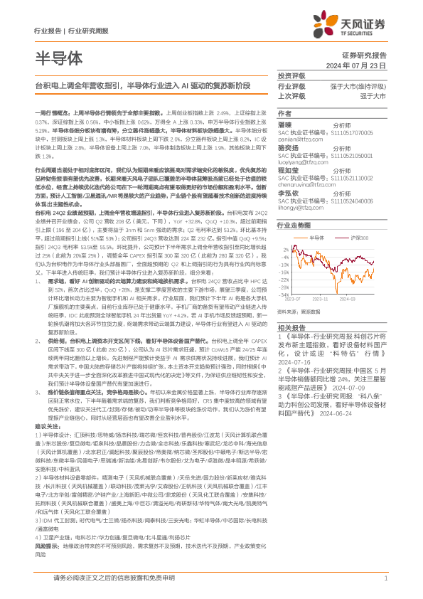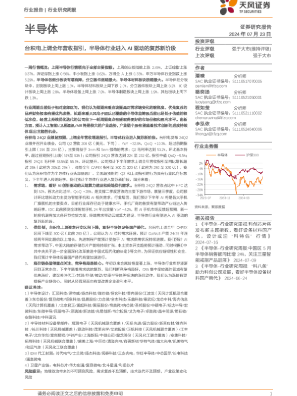 【天风证券】【20240723】20240723-天风证券-半导体行业研究周报:台积电上调全年营收指引,半导体行业进入AI驱动的复苏新阶段-35页