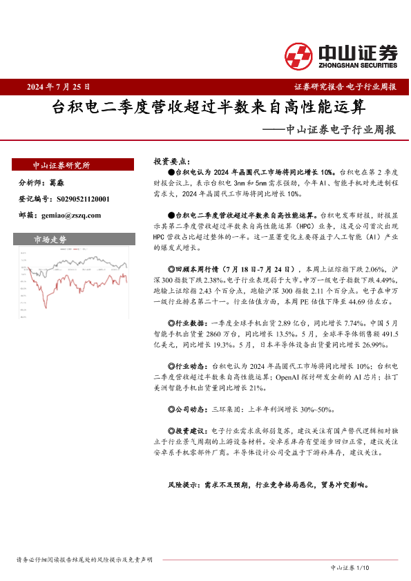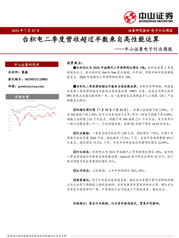 【中山证券】【20240725】20240725-中山证券-电子行业周报:台积电二季度营收超过半数来自高性能运算-10页