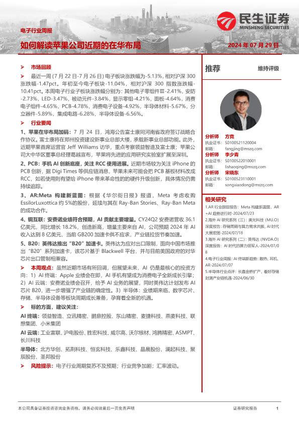 【民生证券】【20240729】20240729-民生证券-电子行业周报:如何解读苹果公司近期的在华布局-23页