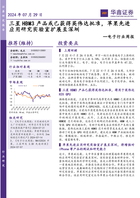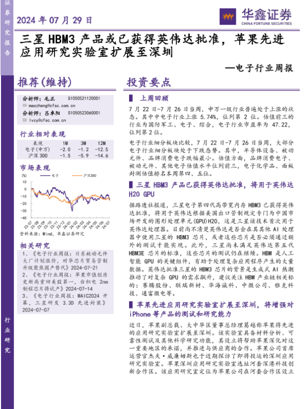 【华鑫证券】【20240729】20240729-华鑫证券-电子行业周报:三星HBM3产品或已获得英伟达批准,苹果先进应用研究实验室扩展至深圳-38页