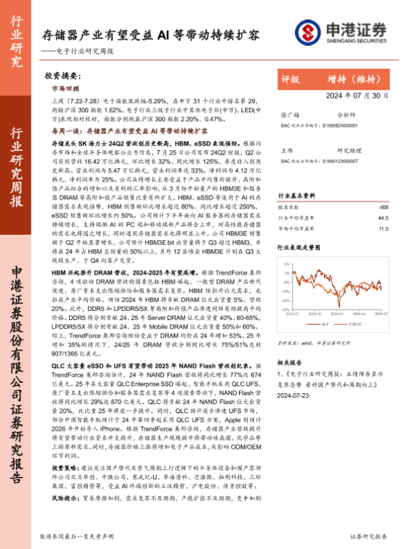 【申港证券】【20240730】20240730-申港证券-电子行业研究周报:存储器产业有望受益 AI等带动持续扩容-10页