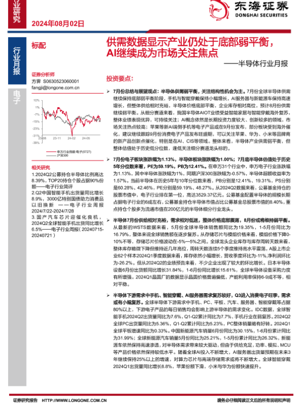 【东海证券】【20240802】20240802-东海证券-半导体行业月报:供需数据显示产业仍处于底部弱平衡,AI继续成为市场关注焦点-30页