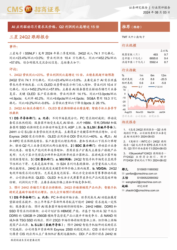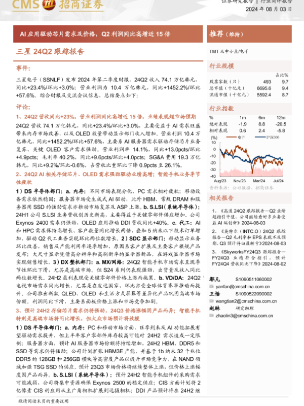 【海通证券】【20240803】三星24Q2跟踪报告-AI应用驱动芯片需求及价格,Q2利润同比高增近15倍-12页