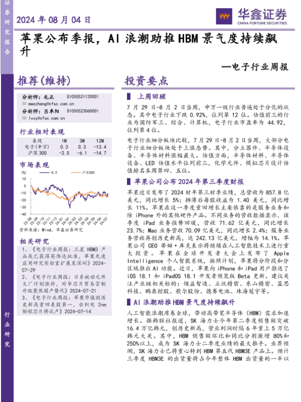 【华鑫证券】【20240804】20240804-华鑫证券-电子行业周报:苹果公布季报,AI浪潮助推HBM景气度持续飙升-36页