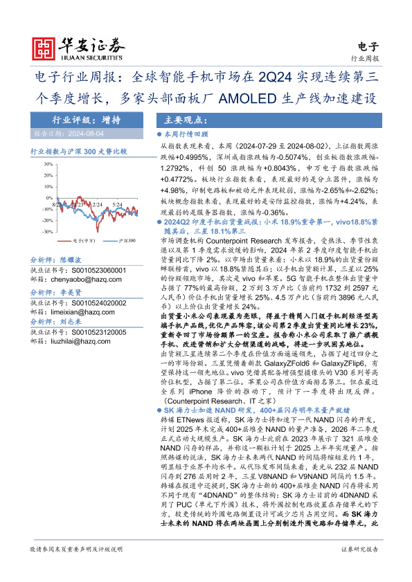 【华安证券】【20240804】20240804-华安证券-电子行业周报:全球智能手机市场在2Q24实现连续第三个季度增长,多家头部面板厂AMOLED生产线加速建设-28页