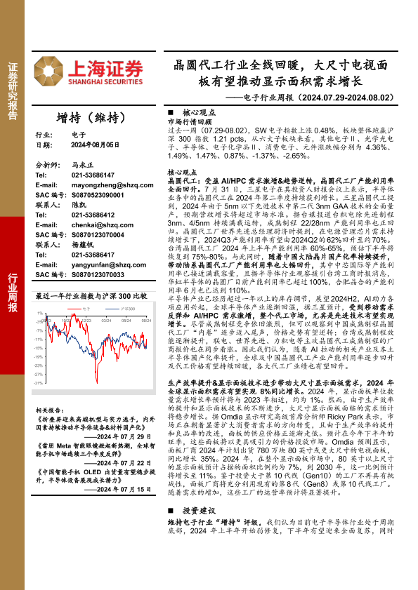 【上海证券】【20240805】20240805-上海证券-电子行业周报:晶圆代工行业全线回暖,大尺寸电视面板有望推动显示面积需求增长-10页