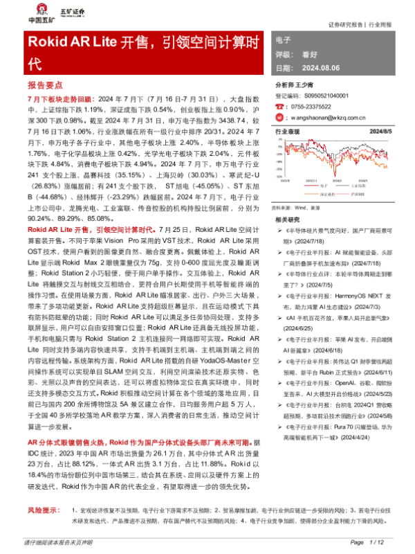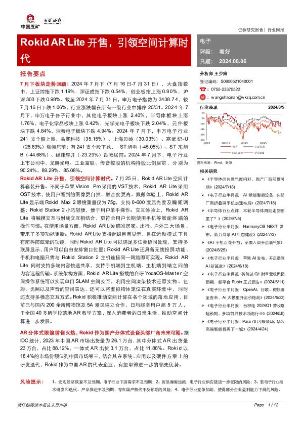 【五矿证券】【20240806】20240806-五矿证券-电子行业周报:Rokid AR Lite开售,引领空间计算时代-12页