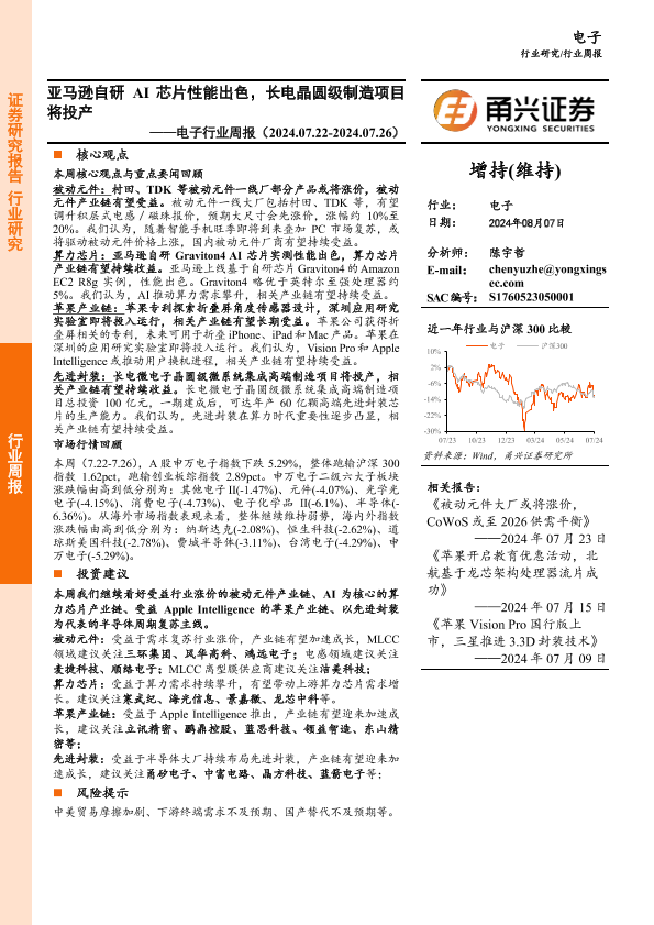 【甬兴证券】【20240807】20240807-甬兴证券-电子行业周报:亚马逊自研AI芯片性能出色,长电晶圆级制造项目将投产-14页