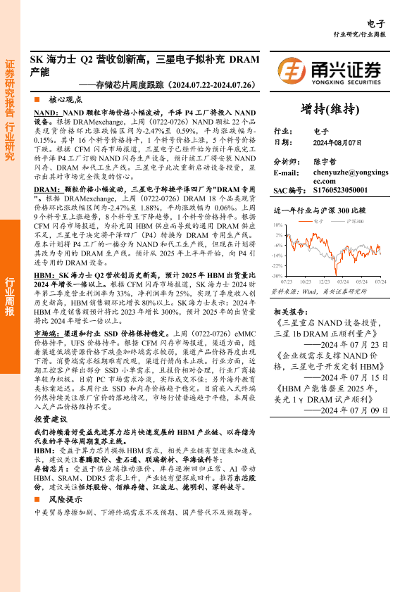 【甬兴证券】【20240807】电子行业存储芯片周度跟踪:SK海力士Q2营收创新高,三星电子拟补充DRAM产能-10页