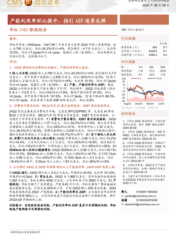 【海通证券】【20240809】华虹24Q2跟踪报告-产能利用率环比提升,指引ASP逐季反弹-11页