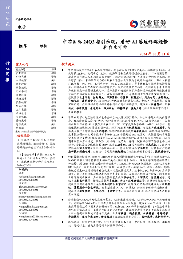 【兴业证券】【20240811】20240811-兴业证券-电子行业周报:中芯国际24Q3指引乐观,看好AI落地终端趋势和自主可控-10页
