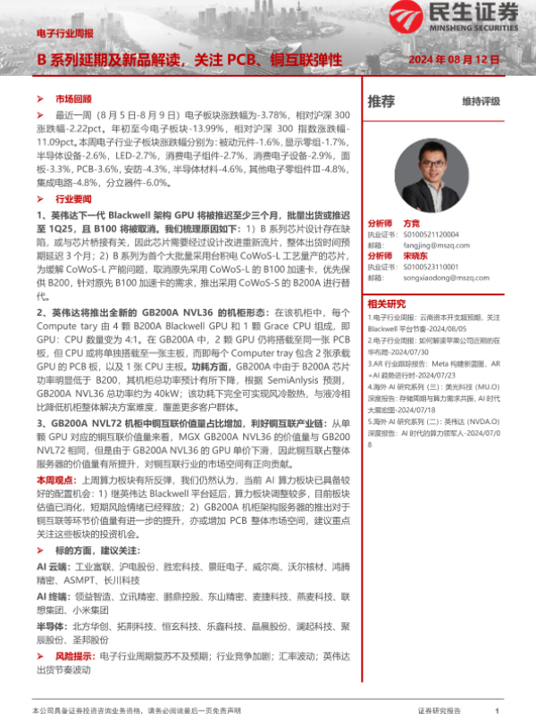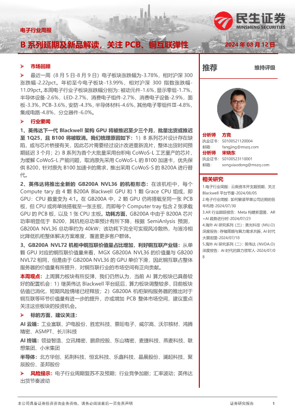 【民生证券】【20240812】20240812-民生证券-电子行业周报:B系列延期及新品解读,关注PCB、铜互联弹性-16页