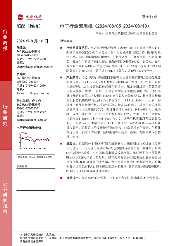 【东莞证券】【20240818】20240818-东莞证券-电子行业双周报:鸿海:Q4开始出货搭载GB200处理器的服务器-10页