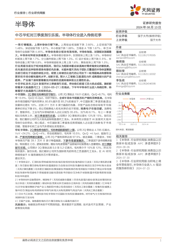 【天风证券】【20240813】20240813-天风证券-半导体行业研究周报:中芯华虹对三季度指引乐观,半导体行业进入传统旺季-33页