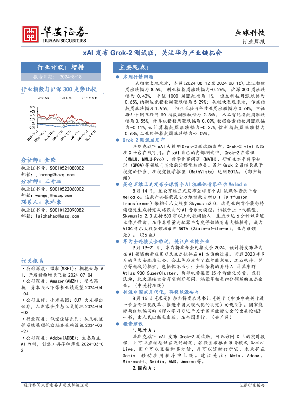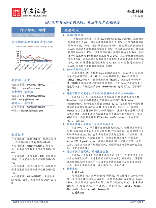 【华安证券】【20240818】全球科技行业周报:xAI发布Grok-2测试版,关注华为产业链机会-20页