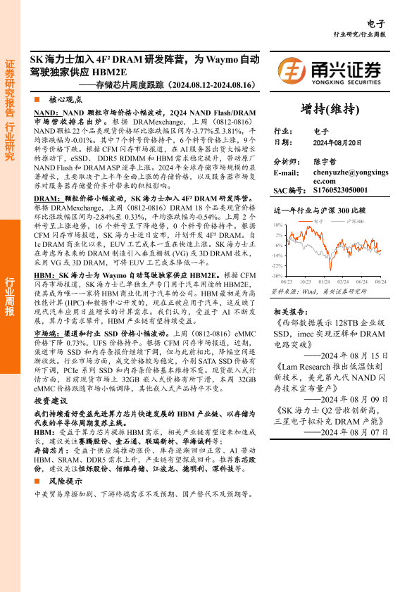 【甬兴证券】【20240820】20240820-甬兴证券-存储芯片周度跟踪:SK海力士加入4F²DRAM研发阵营,为Waymo自动驾驶独家供应HBM2E-10页