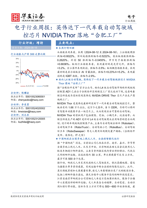 【华安证券】【20240818】20240818-华安证券-电子行业周报:英伟达下一代车载自动驾驶域控芯片NVIDIA Thor落地“合肥工厂”-32页