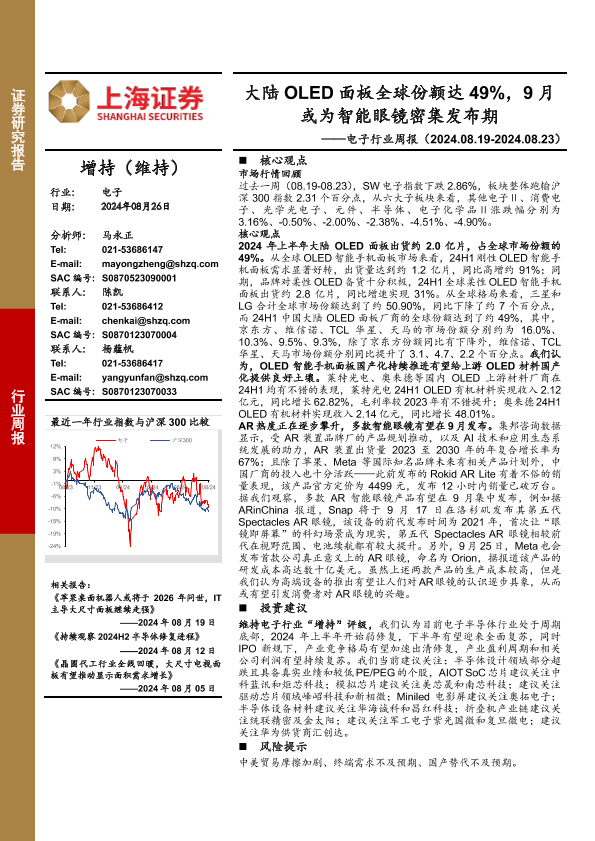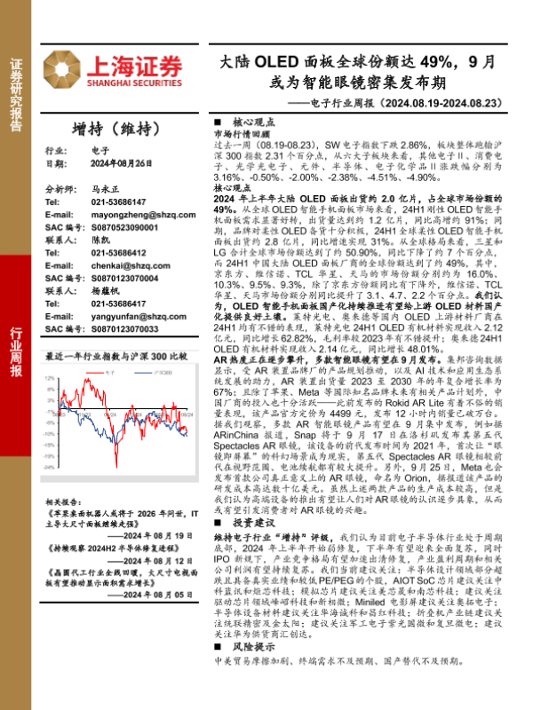 【上海证券】【20240826】20240826-上海证券-电子行业周报:大陆OLED面板全球份额达49%,9月或为智能眼镜密集发布期-10页