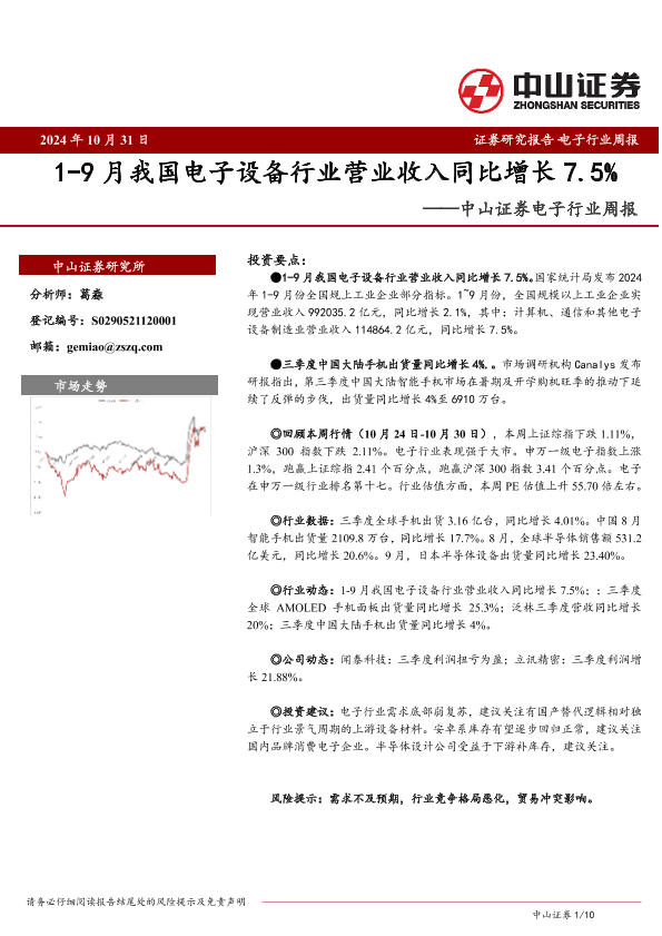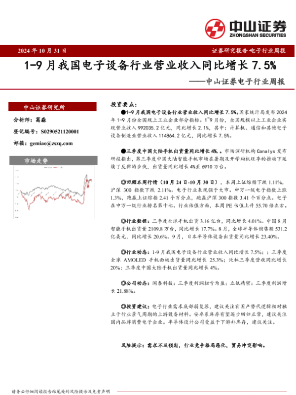 【中山证券】【20241031】20241031-中山证券-电子行业周报:1-9月我国电子设备行业营业收入同比增长7.5%-10页