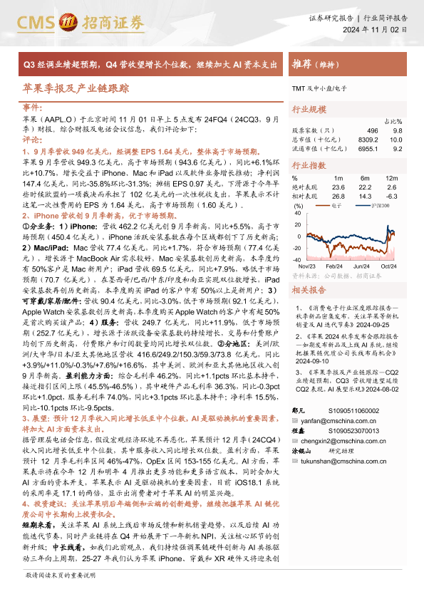 【海通证券】【20241102】苹果季报及产业链跟踪:Q3经调业绩超预期,Q4营收望增长个位数,继续加大AI资本支出-12页