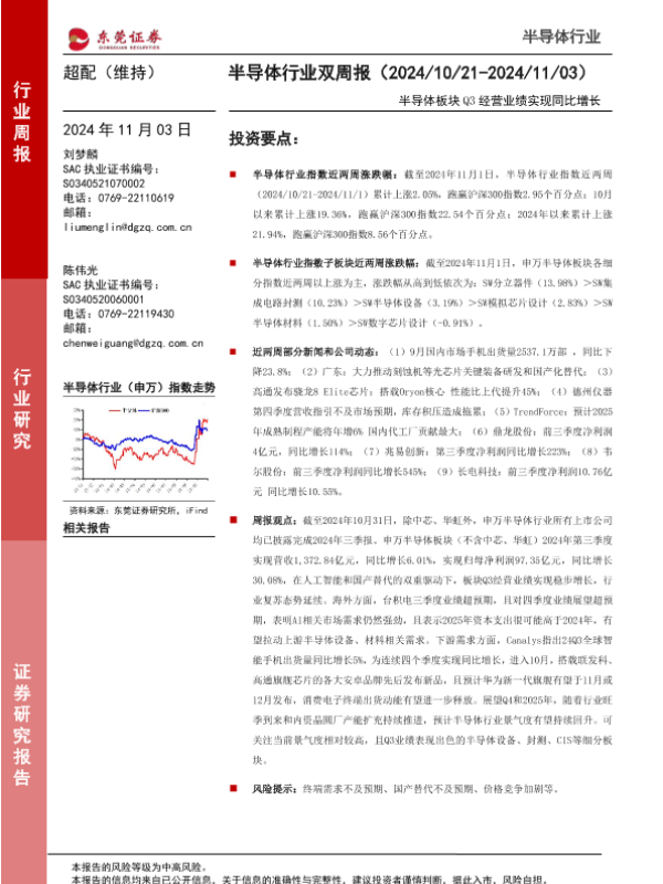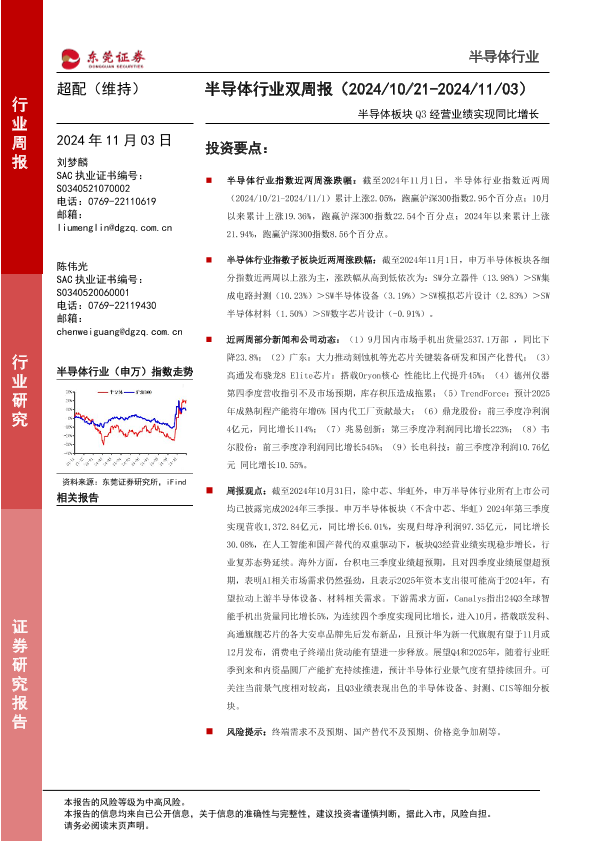 【东莞证券】【20241103】半导体行业双周报:半导体板块Q3经营业绩实现同比增长-16页