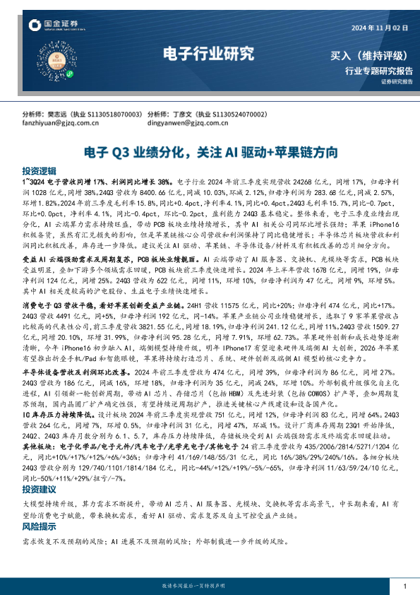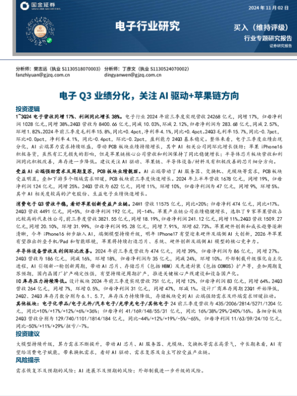 【国金证券】【20241102】电子行业研究:电子Q3业绩分化,关注AI驱动+苹果链方向-32页