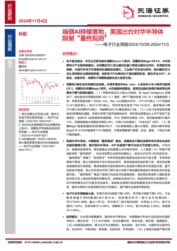 【东海证券】【20241104】20241104-东海证券-电子行业周报:端侧AI持续落地,美国出台对华半导体限制“最终规则”-15页