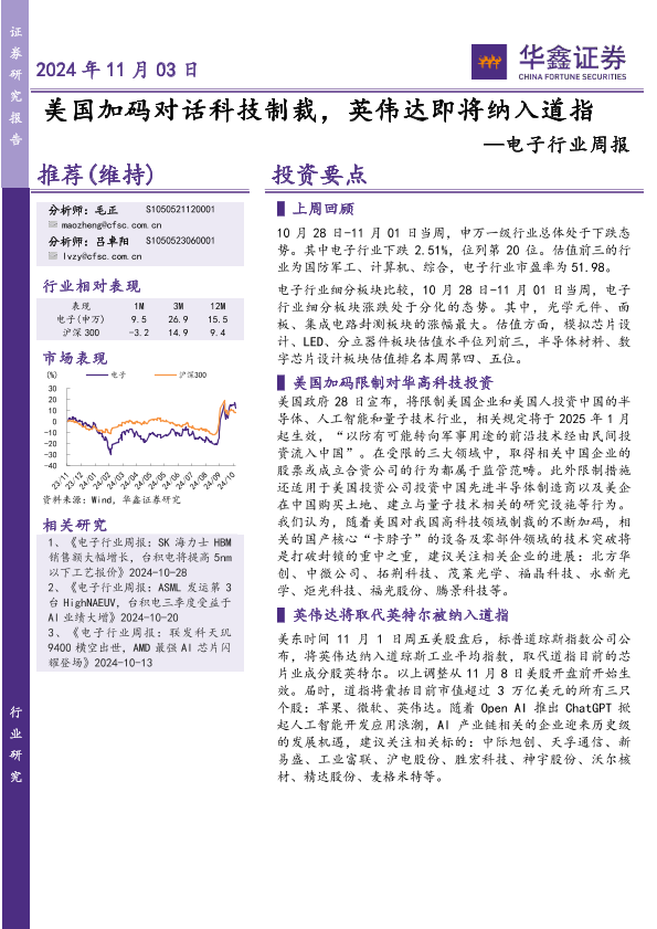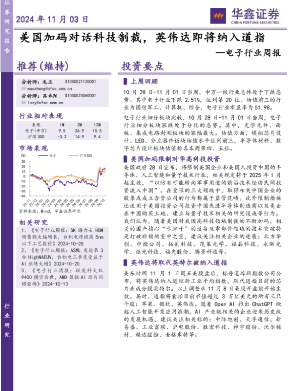 【华鑫证券】【20241103】20241103-华鑫证券-电子行业周报:美国加码对话科技制裁,英伟达即将纳入道指-42页