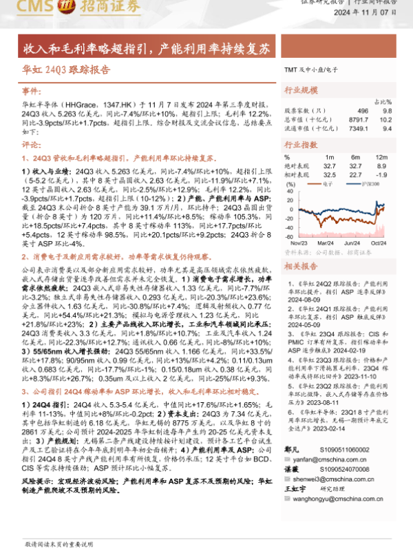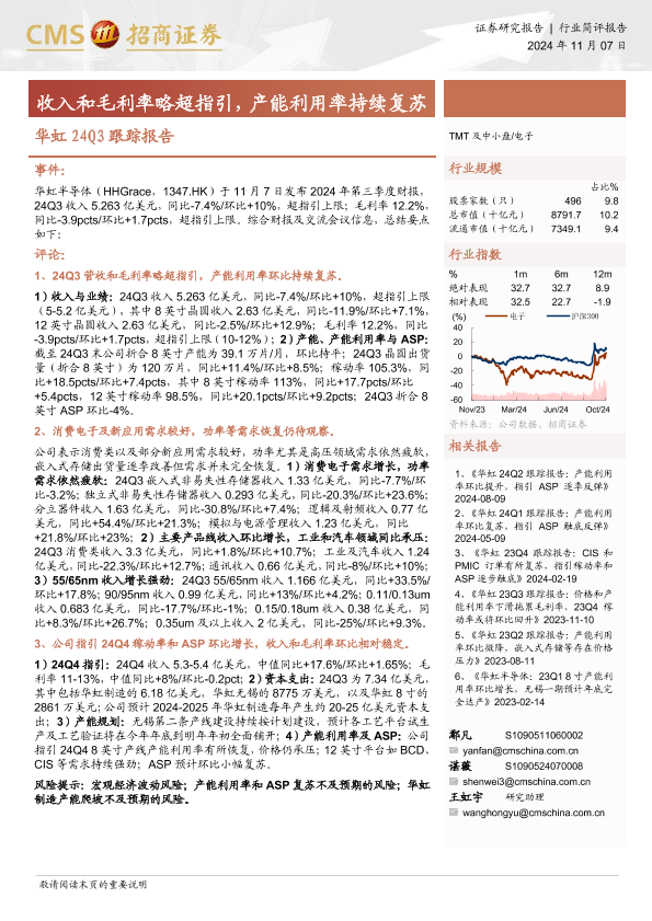 【海通证券】【20241107】华虹24Q3跟踪报告-收入和毛利率略超指引,产能利用率持续复苏-12页