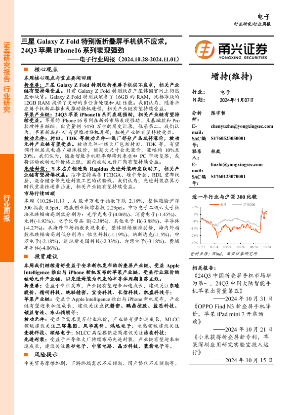 【甬兴证券】【20241107】20241107-甬兴证券-电子行业周报:三星Galaxy ZFold特别版折叠屏手机供不应求,24Q3苹果iPhone16系列表现强劲-15页