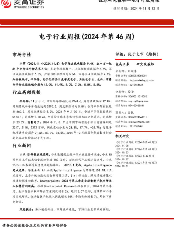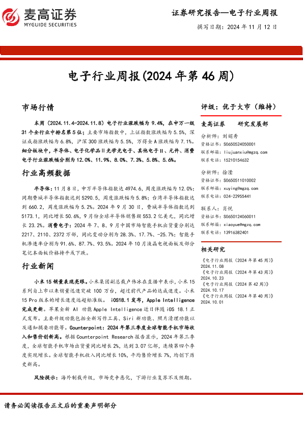 【麦高证券】【20241112】电子行业周报(2024年第46周)-17页
