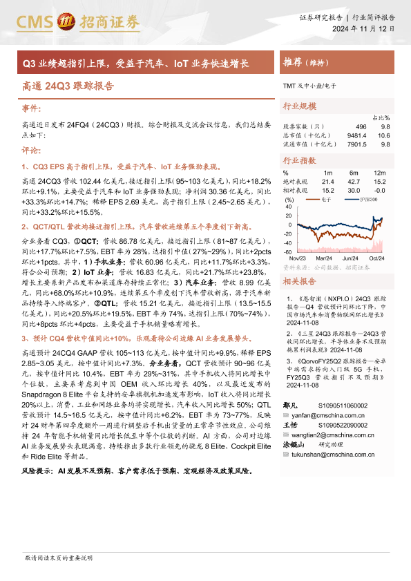 【海通证券】【20241112】高通24Q3跟踪报告:Q3业绩超指引上限,受益于汽车、IoT业务快速增长-10页