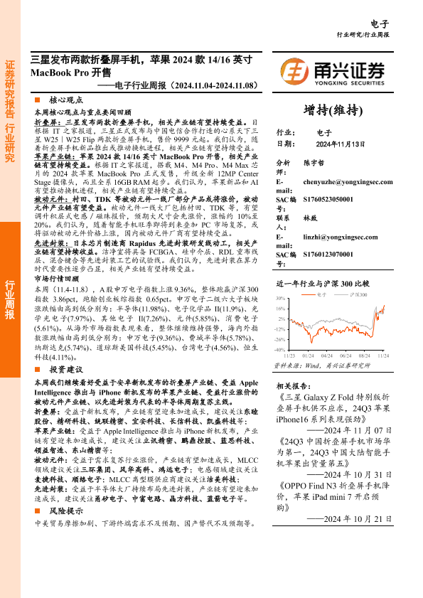 【甬兴证券】【20241113】20241113-甬兴证券-电子行业周报:三星发布两款折叠屏手机,苹果2024款14 16英寸MacBook Pro开售-15页