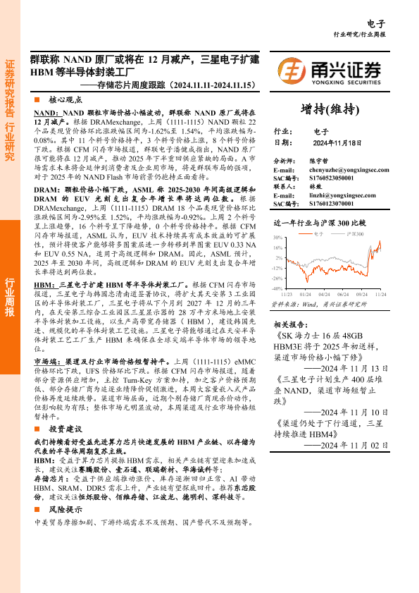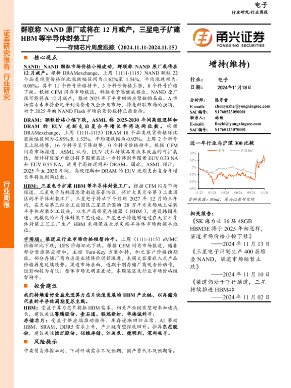 【甬兴证券】【20241118】20241118-甬兴证券-存储芯片行业周度跟踪:群联称NAND原厂或将在12月减产,三星电子扩建HBM等半导体封装工厂-10页