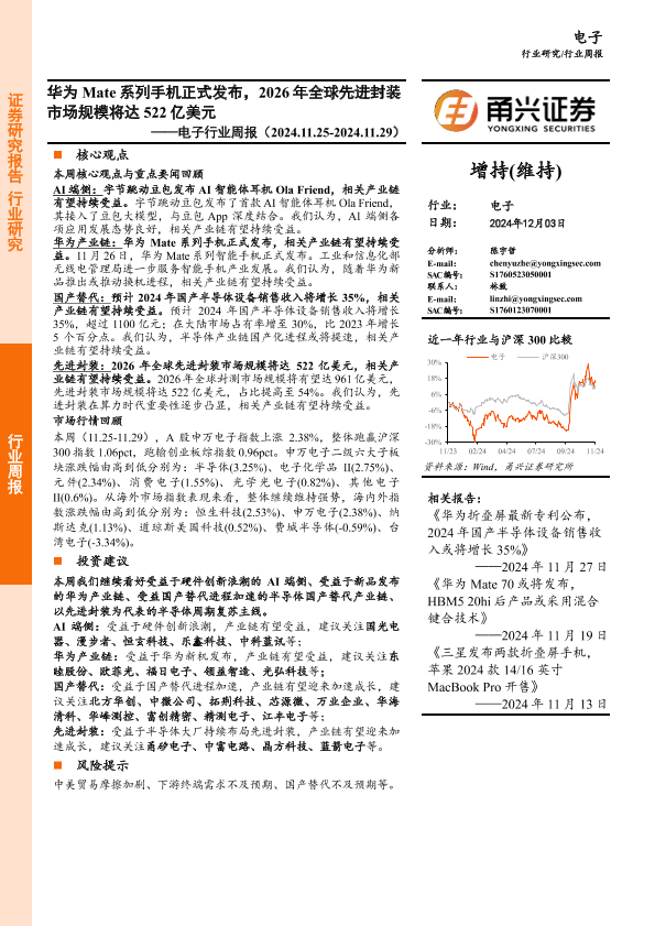 【甬兴证券】【20241203】20241203-甬兴证券-电子行业周报:华为Mate系列手机正式发布,2026年全球先进封装市场规模将达522亿美元-14页